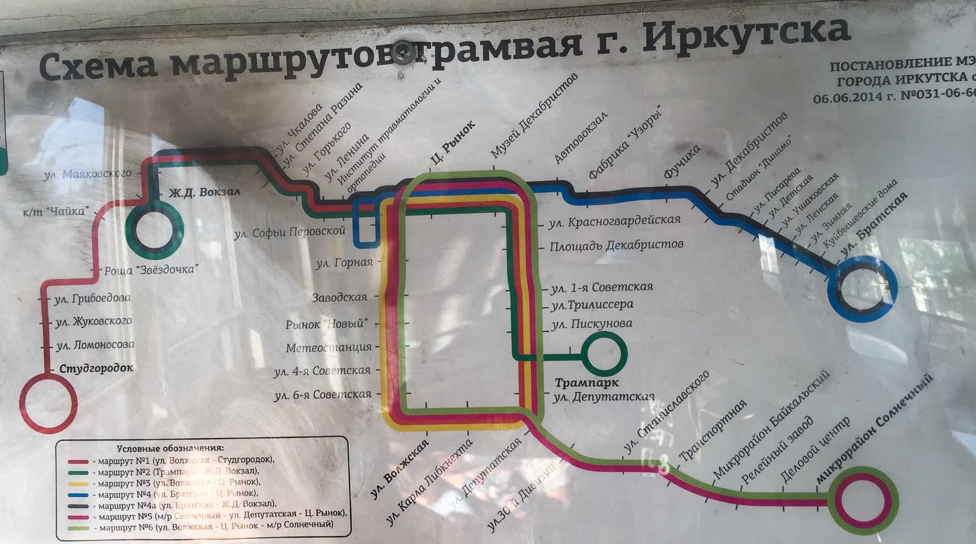 In der Straßenbahn hängt ein Liniennetzplan von Irkutsk vorne im Wagen. Ich habe ihn für Dich zur groben Orientierung “cheap and dirty” abfotografiert. Der Linienplan hängt dort seit 2014.